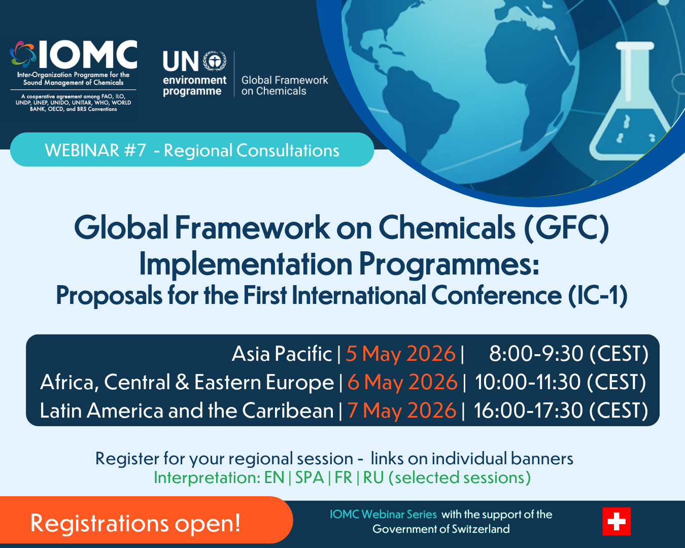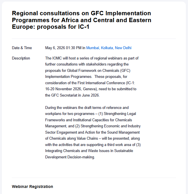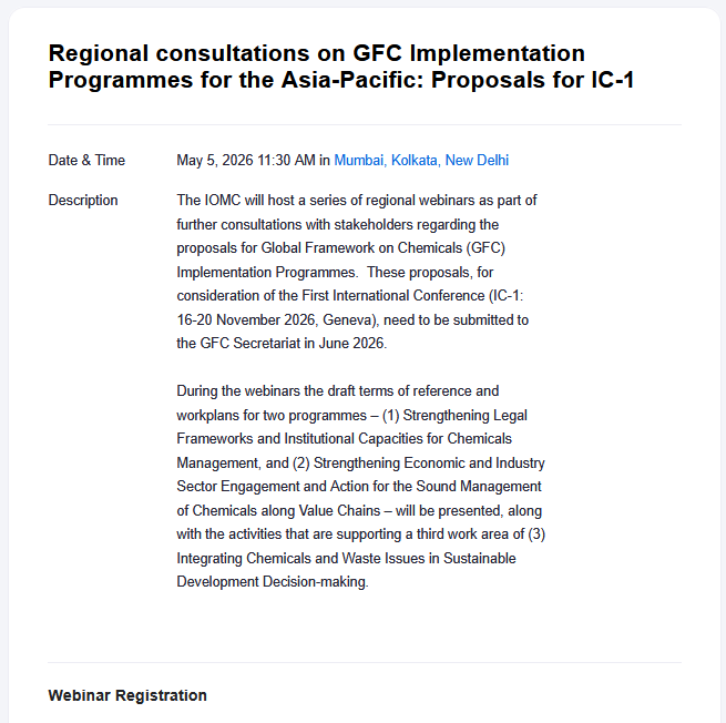 The IOMC will host a series of regional webinars as part of further consultations with stakeholders regarding the proposals for Global Framework on Chemicals (GFC) Implementation Programmes. These proposals, for consideration of the First International Conference (IC-1: 16-20 November 2026, Geneva), need to be submitted to the GFC Secretariat in June 2026.